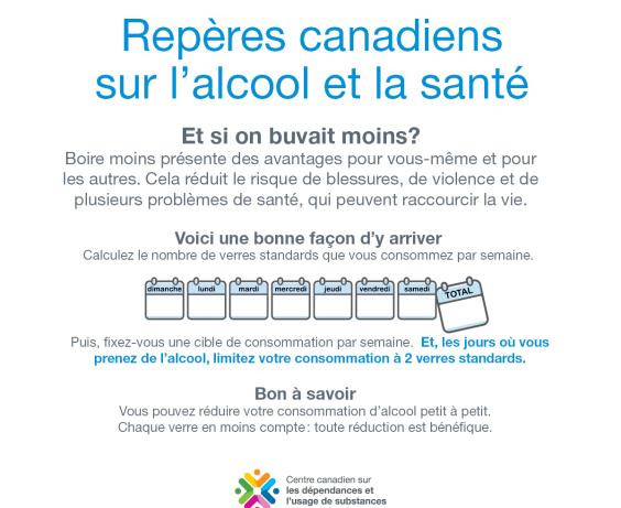 | Résumé grand public des Repères canadiens sur l’alcool et la santé : boire moins, c’est mieux (infographie) | 2023 | Résume graphiquement et en termes simples les recommandations présentées dans les Repères canadiens sur l’alcool et la santé. Offre des explications concises et en image des risques et méfaits associés au continuum de consommation d’alcool, ainsi que des conseils pour diminuer ces risques. |