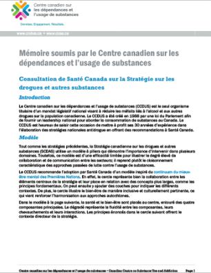 Présente les recommandations faites par le CCDUS concernant la Stratégie sur les drogues et autres substances de Santé Canada. Le mémoire recommande l’adoption d’un modèle inspiré du continuum du mieux-être mental des Premières Nations, décrit les objectifs et principes sur lesquels devrait reposer la stratégie et aborde des points comme le contenu, les priorités et la gouvernance de la stratégie.