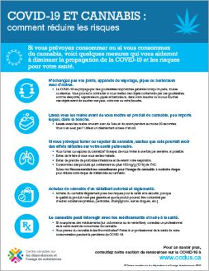 Affiche d’une page qui présente quelques conseils pratiques pour diminuer la propagation de la COVID-19 et les risques que pose l’usage de cannabis pour la santé.